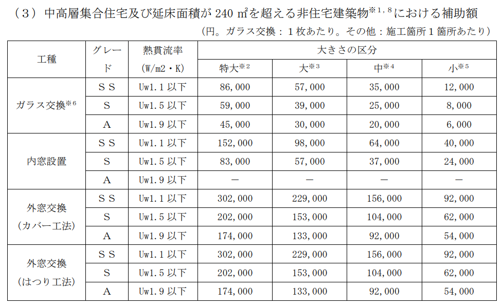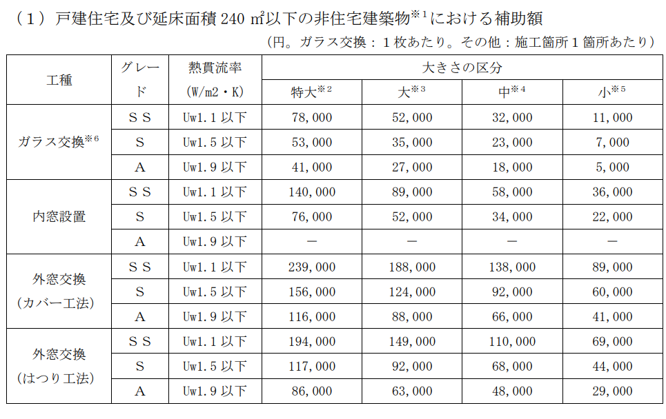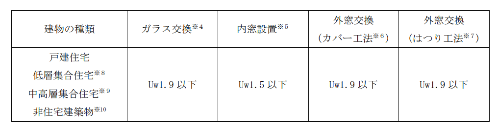 補助対象事業に該当する工事のうち、事務局に登録され、その性能が下表に掲げる熱貫流率の基準を満たす窓へ改修する工事について、補助金交付の対象とします。