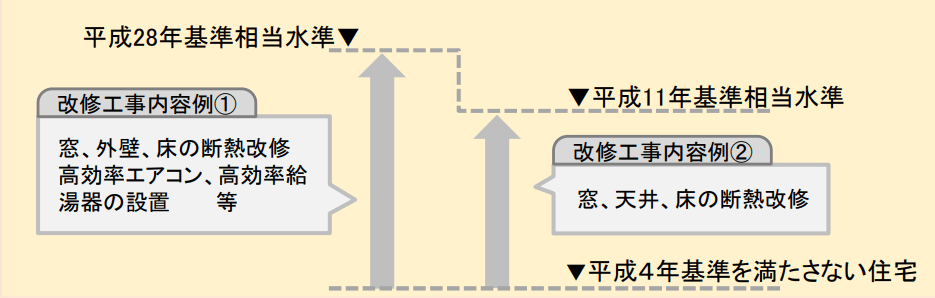 次の①から⑧までに掲げる項目に該当するリフォーム工事※1※2 等を対象とします。ただし、対象住宅(平成 4 年基準を満たさない住宅又は平成 11 年基準を満たさない住宅)について一定以上の省エネ性能を確保するリフォーム工事として、次の①から③までの項目に含まれる改修工事の組合せであって、要件を満たす組合せによるリフォーム工事を実施することが必要であるほか、1申請当たりの合計補助額が5万円未満の場合は申請できません。なお、申請する際には、対象工事に関する証明書等が必要になります。