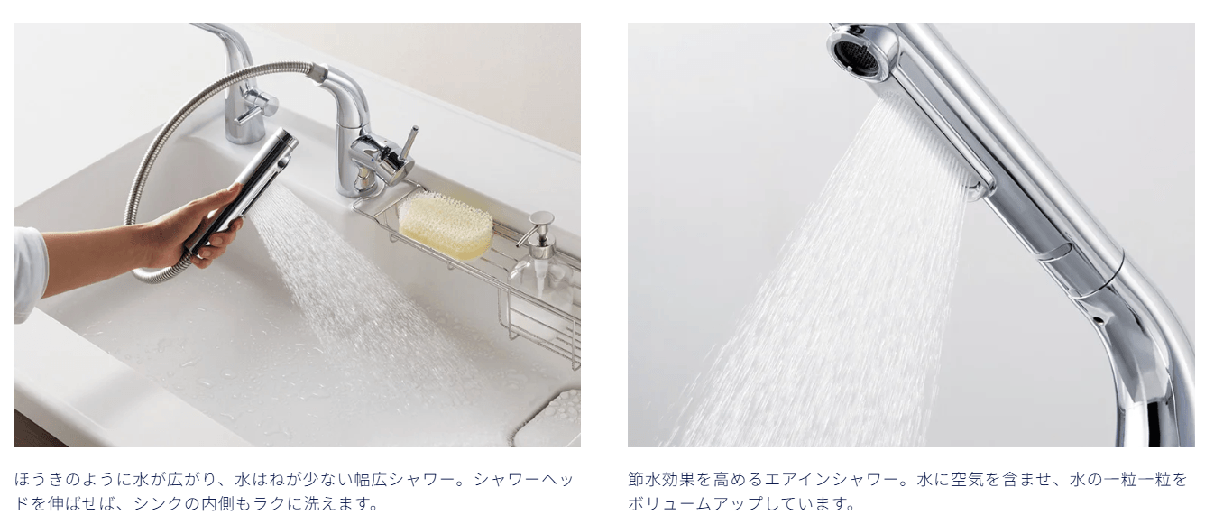 - 水ほうき水栓(ハンドシャワー式):ほうきのような幅広のシャワーが、お皿の汚れを一気に洗い流します。エアイン(空気を混ぜる)技術により、節水しながらもしっかりとした洗浄力を実感できます。