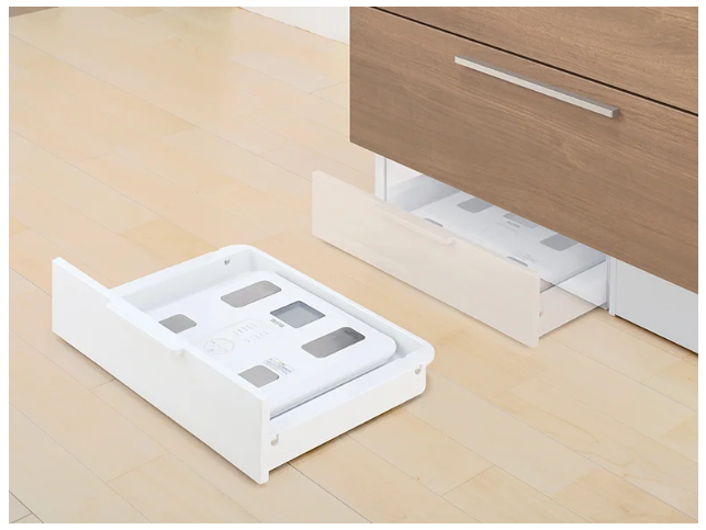 足元に体重計や踏み台をしまえるスペースがあるタイプを選べば、見た目がすっきり、掃除もらくらくです!スムーズに引き出せる車輪が付いておりながら、乗って体重が加わるとしっかりと固定されるタイプは、収納スッキリなのに便利な優れものです!