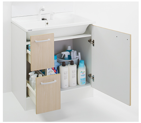 洗面台の下が収納ではなく空いているタイプを選ぶと、椅子に座ったまま身支度ができます。将来的に車椅子対応もしやすくなります。