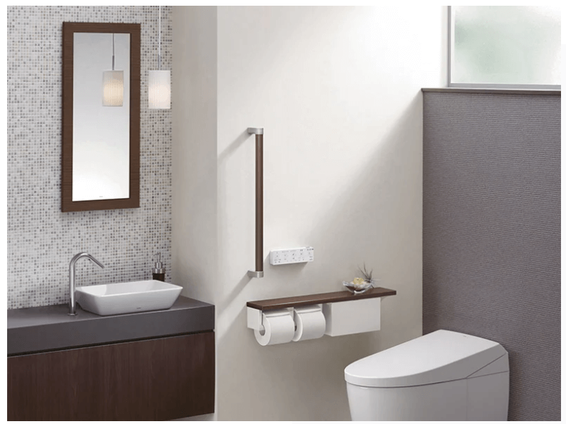 ・あえて「今」設置する理由: 壁の補強工事が必要な場合、リフォーム時についでに設置しておくことで、後付けするよりも見た目が美しく、費用も抑えられます。今のうちから「紙巻器一体型の手すり」など、デザイン性の高いものを選べば、介護用品のような圧迫感もありません。