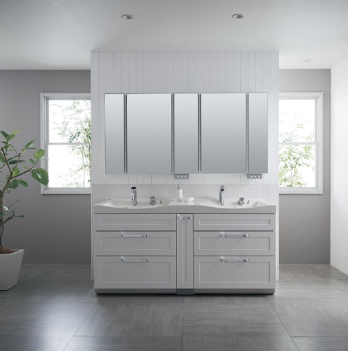 カウンター幅が広い分、天板下やミラーキャビネット部分を有効活用することで、大容量の収納が確保できるのもよいところ!一緒に収納計画も見直すことをおすすめします。カウンター幅が広い分、天板下やミラーキャビネット部分を有効活用することで、大容量の収納が確保できますね。