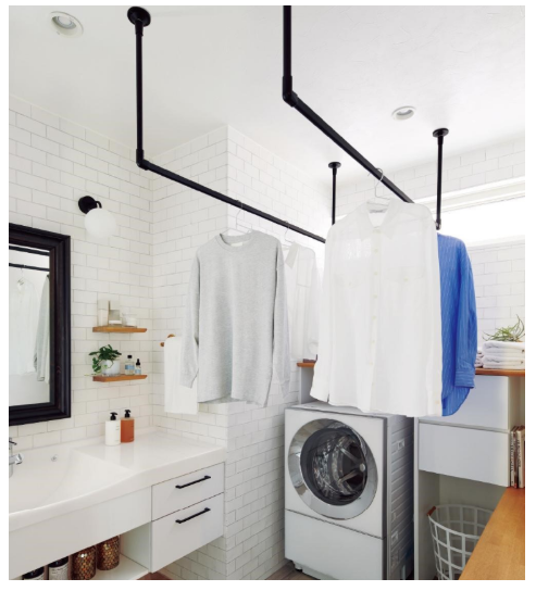 ・家事貯金のポイント: 脱衣所にガス乾燥機の幹太くん+「室内物干し」と作業カウンターの併設があれば最強!洗濯が終わったら、洗濯機から出してすぐ幹太くんにお任せ!おしゃれ着などはその場で干し、乾いたらその下のカウンターで畳みます。物干しといっても、おしゃれなアイアンバータイプならインテリアとしても◎。