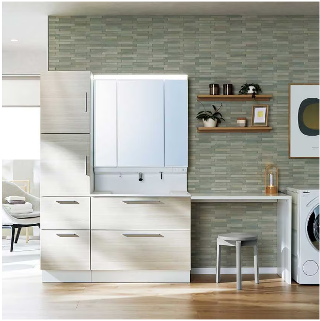 共働き家庭にとって、洗濯は最も重労働な家事の一つです。ベランダまで重いカゴを運び、乾いたら取り込んでたたみ、各部屋へ…。この動線を短縮するのが脱衣所(洗面所)のアップグレードです!