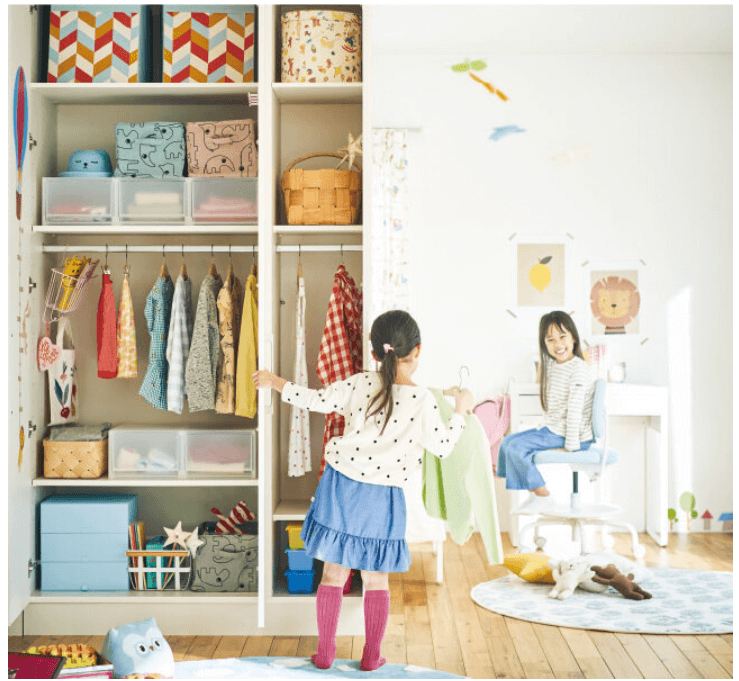 ・「見せる」と「隠す」のバランス: ランドセルや教科書など、毎日使うものは「出し入れしやすいオープン棚」へ。逆にごちゃつきやすいおもちゃ類は「扉付きの隠す収納」へ。こども部屋のクローゼット、意外と使いこなせていないかも?おすすめは、LIXILの「すっきり棚」の設置!