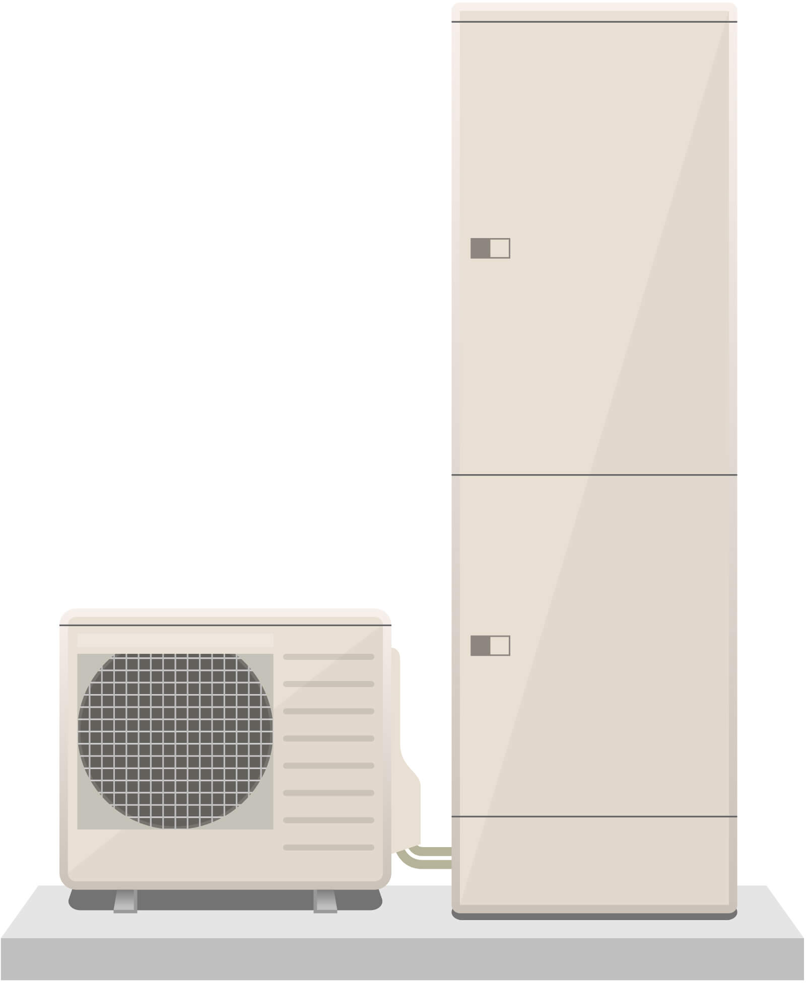 「ヒートポンプ」は、エコキュートだけでなく、エアコン、冷蔵庫、洗濯乾燥機など、身近な家電に欠かせない省エネ技術です。冷媒という物質を圧縮・膨張させることで、外気から熱を吸収したり放熱したりします。ゼロから熱を作るのではなく「今ある熱を運ぶ」だけなので、少ない電気代で大きな熱エネルギーを生み出すことができる技術です。